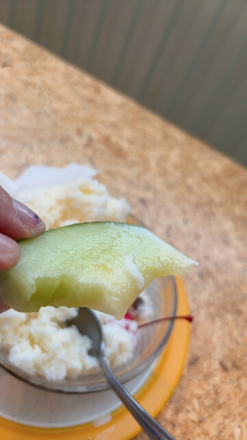 ただ、上に軽く、寒天やみかんがトッピングしてあるので食べている途中で崩れ落ちて、受け皿が小さいのでテーブルに落下〜