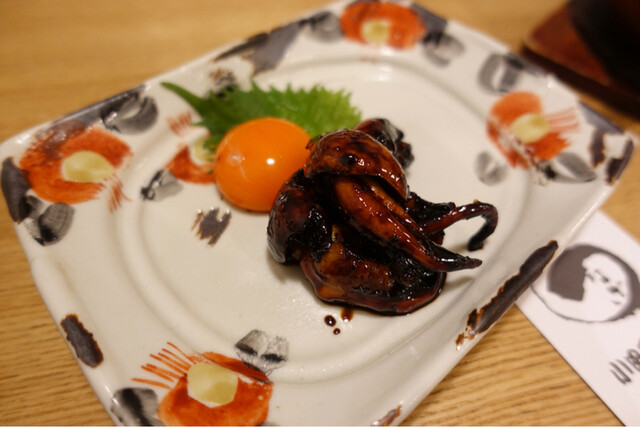 まずはきも焼き 串に刺しではなく小皿できます。キモは甘だれでしっかり味付けしてあって卵黄と絡めて食べます。