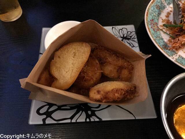 ココナッツシュリンプトーストはカリッとしたパンにエビペーストのフワフワした感触が絶妙。