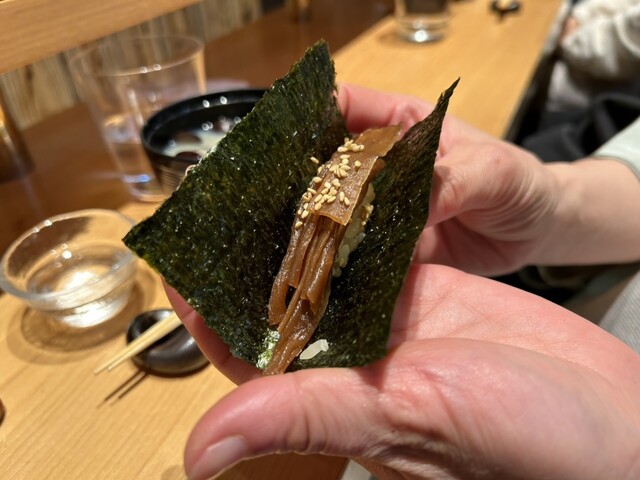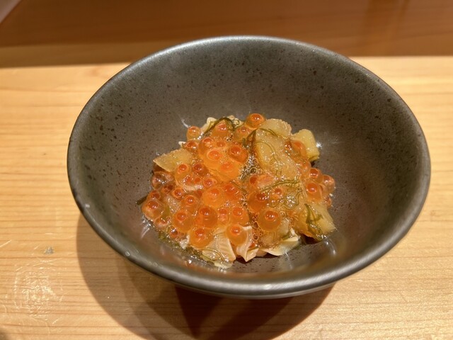 本日ののお食事はしじみの一番出汁から始まり、鰆、めかぶ、鮑の柔らか煮、寿司屋のぶり大根、帆立、湯葉、山牛蒡、白海老のにぎり、ずわい蟹の茶碗蒸し、小肌、馬糞雲丹、松前漬けとイクラの丼、あん肝と奈良漬、べったら漬け、ネギトロ巻き、漬鮪、中トロ、具沢山しじみ汁、穴子、干瓢巻き、卵焼きで上がりです。