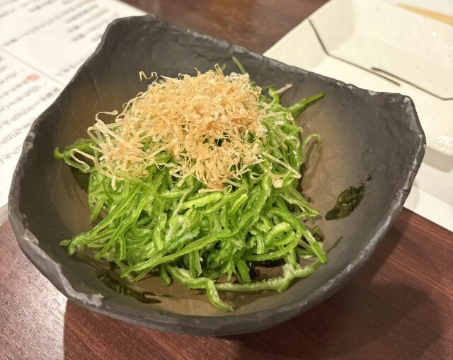 まずは鉄板の「塩ピーマン」。シャキッとした歯ごたえ、ほのかに苦みを残しつつ、絶妙な塩加減が…完全に優勝。これ、ガチで日本一!これを食べるためだけに来てもいいレベル。