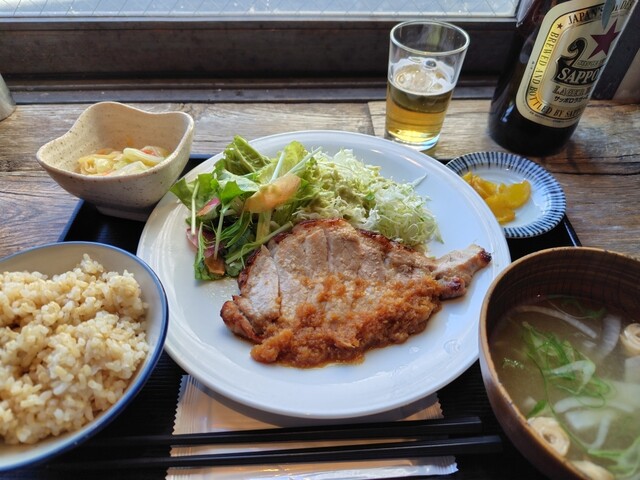 いわゆる豚肉生姜焼きですが、こちらのは厚切りロースに生姜のタレが添えられています。