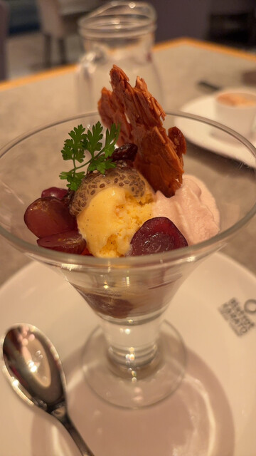 締めは、温かいコーヒーとデザート。葡萄のフルーツパフェでした。サッパリした味が、トレビアン。締めにふさわしいお味でした。