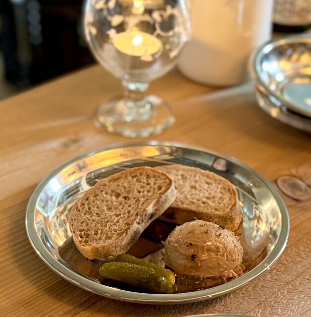 ビールのグラスが、白い柄の入った丸いステムグラスで石造りのお店の雰囲気にピッタリ♪