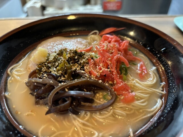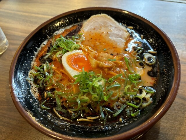 博多ラーメンに煮卵トッピング個人的にはこれがベストなんですが、赤ラーメンに黒をトッピング
