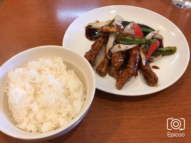 最後に、黒醋排骨 (黒酢の酢豚) と ライス。黒酢の酢豚の豚肉は、この辺りでは珍しい棒状タイプ。黒酢が効いて、時々ハフッとなりますが またそれが良き哉。
