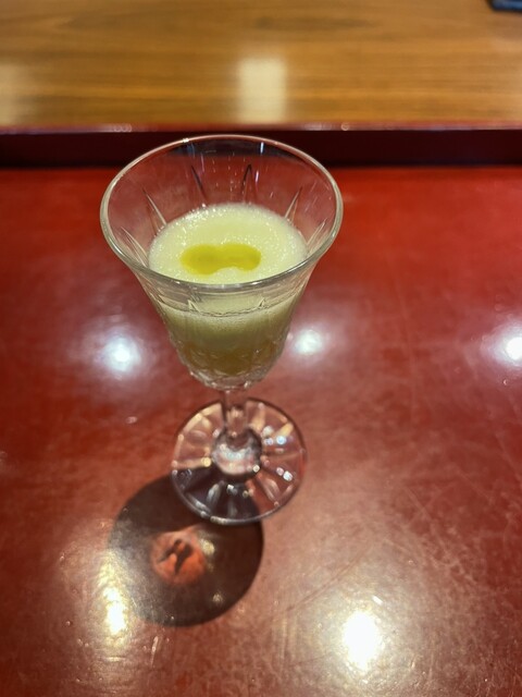 島のマクワウリにメロンを合わせ、自家農園で収穫した果実から絞ったオリーブオイルを使用したもの。