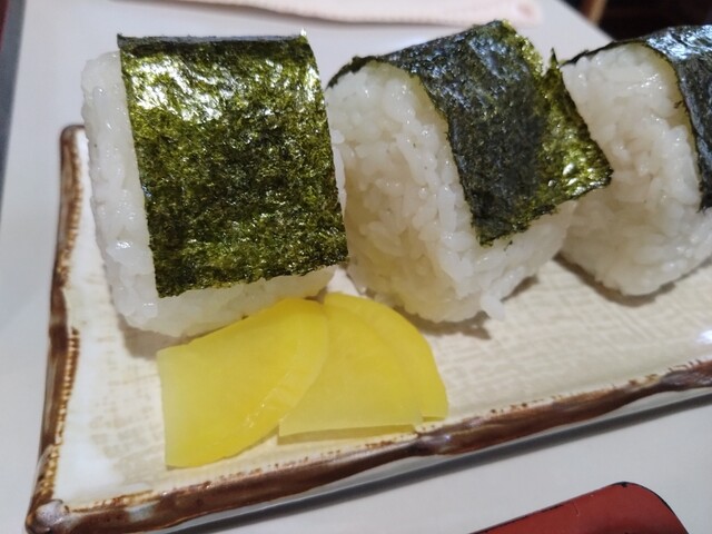 おにぎりは、おかか、昆布、梅干しの3つも付きます。塩分は強めでしたがふんわり握られており、なかなかいけました。