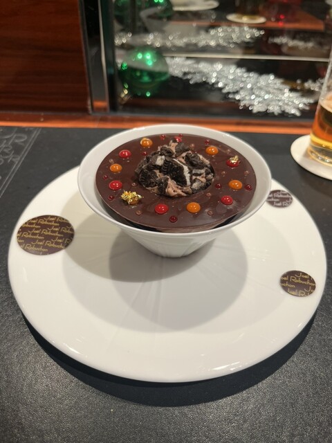 なめらかなショコラのガナッシュ ビタークッキーでコーティングしたカカオのグラス。