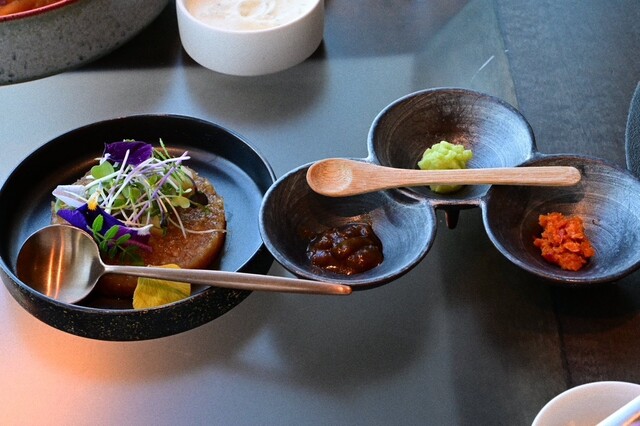 ステーキの薬味。大根おろし、みそ、わさび、柚子胡椒