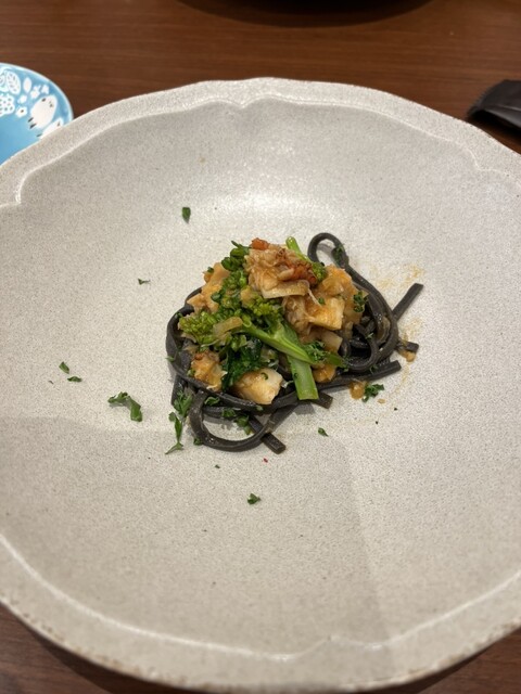 パスタは2種類、イカ墨を練り込んだリングイネ、金目鯛と菜の花のソテーが入っており美味しい