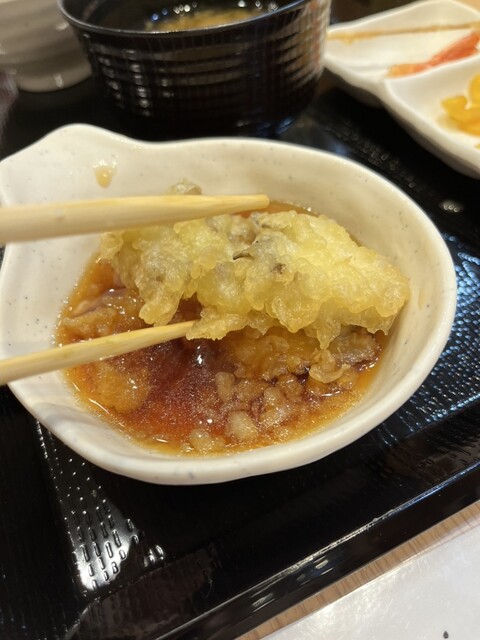 ごはんを半分でおかわりをしてたまご天をご飯の乗せ出汁醤油をかけて締めました