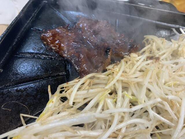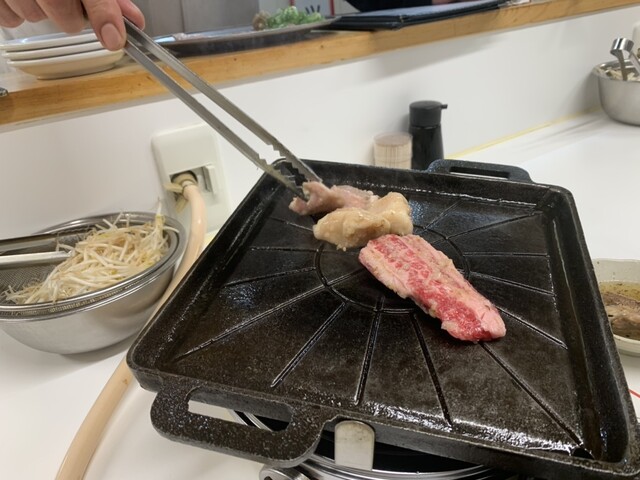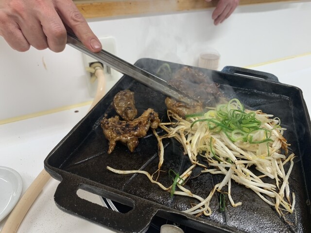 鉄板の角に穴が開いていて、焼いた時に出る脂や野菜の汁などをすべてこの味噌ダレの入った器で受け止める様になっていて、あとでこの黒ダレを使って焼く時に、その旨みも含めて頂ける仕組み。