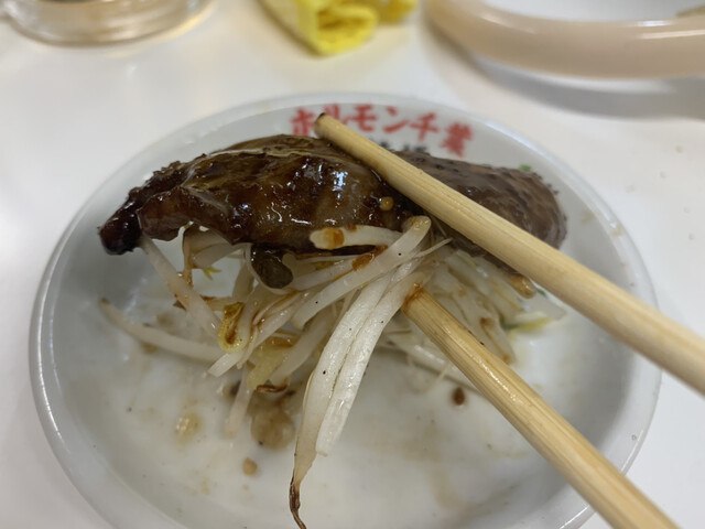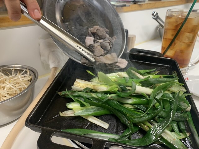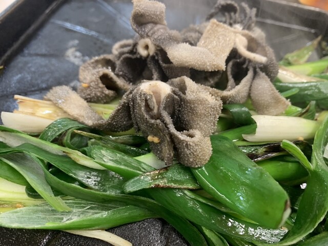 シャキシャキのネギをしっかり焼いたところにセンマイが乗せられ、軽く焼いたら韓国味噌ダレか塩胡麻油で食べる。味噌ダレがクセになる味で、センマイとネギの歯応えと沁み出るネギの甘さがめっちゃ美味しー♪
