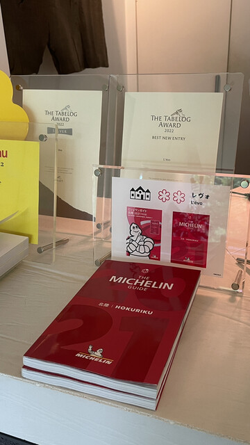 高い天井と明るい店内、フロントには食べログ・ミシュラン等のプレートが並べられています。
