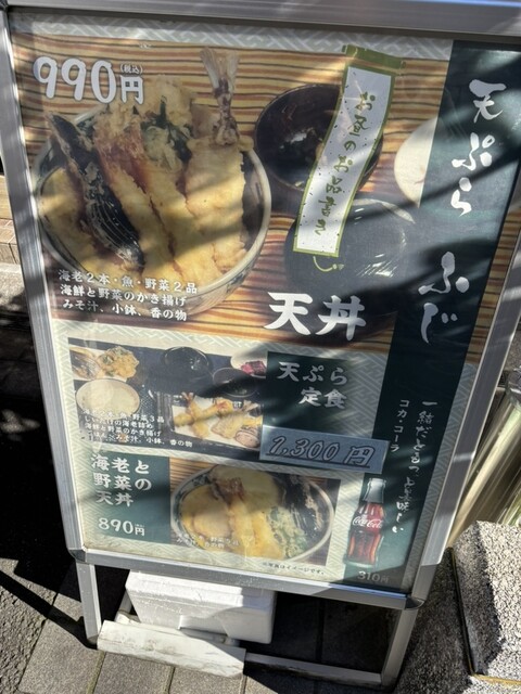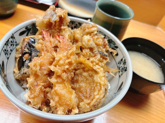 小さめの海老が2本、茄子、さつまいも、キス、かき揚げがのっていました。
