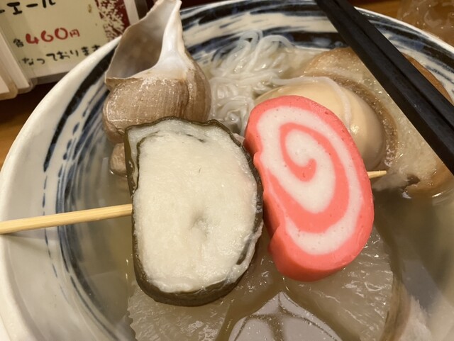 180円のメニューから大根、玉子、糸こん、くるまふ。