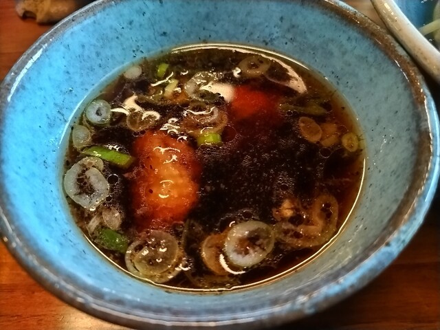 つけ汁は甘からくてこっさりした感じで麺をやさしく包み込んでくれます つけ汁の中には炭火焼きの鶏肉がコロコロ、これだけでも料理として充分いけます!