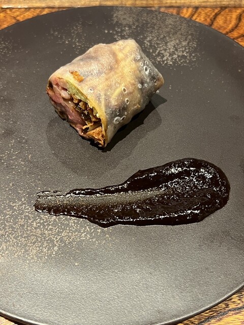 石垣牛のグレープ巻き、甜麺醤ベースの味噌ソースを添えて。
