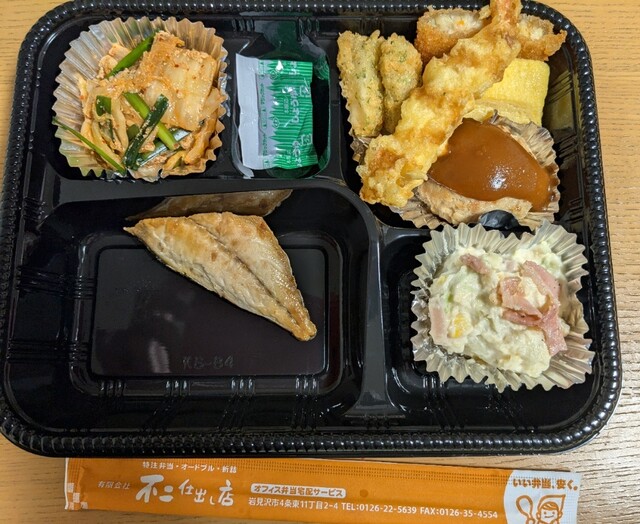 メインのお魚は安定の焼きサバ。レギュラーコーナーは海老フライではなく、海老天のようです。ハンバーグは初見のデミソースでした。他、ニラと白菜たっぷりの豚キムチとおじゃががゴロンの素朴なポテトサラダ。青のりがチラつく揚げ物は白身魚フリッターでした。