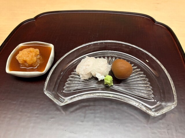 ①一瞬焼いた鱧、大根おろし、梅干、山葵