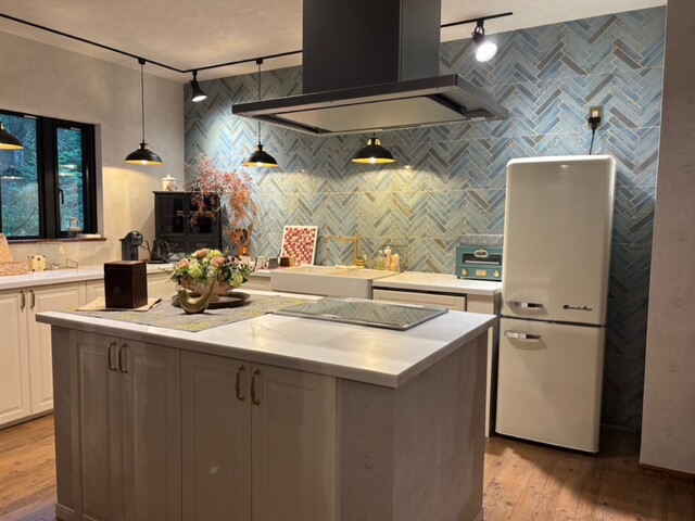 曲線の三角屋根が可愛いコテージに入ると中は別世界、白と木を基調とした温もりを感じる空間にはアンティーク調の調度品や暖炉、テーブルには欧風のクロスやカトラリーが綺麗に置かれ、落ち着いた癒しの空間が演出されています。