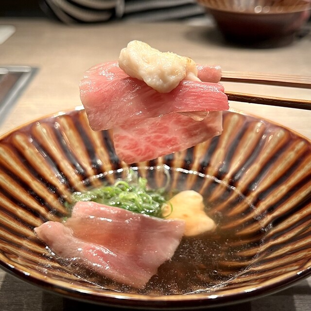 こちらはジャンルでいうと焼肉屋だが、お肉料理屋さんという方がしっくりきそう。ただお肉を焼くだけではなく、お肉を使った趣向に富んだ品々。使われる食材は全てが一級品。お肉は内臓系以外は36ヶ月という長期飼育された旨味の詰まった田村牛。さらにはズワイガニやキャビア、フォアグラ、トリュフなどの高級食材をふんだんに使用して格の違いを感じます。