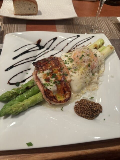 メニューを丁寧に説明頂き、先に前菜からメインまでオーダーするスタイル。前菜:玉ねぎロースト、ホワイトアスパラスフレ、鮎のコンフィ、鮮魚の炭炙り(鰆) パスタ:アラビアータ(イカ墨麺) メイン:豚肉(月に一回程度入荷するスペシャリテ)。ワインは都度お勧めをオーダー。全て期待を上回り、ワインは本当に美味しい!知れてよかったお店です!また近々伺います!