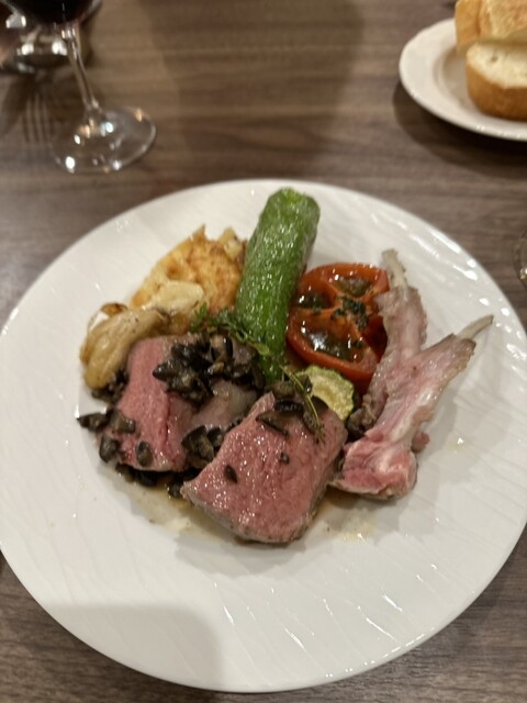 メインは主人は仔羊、私は牛ホホ肉のワイン煮。仔羊は柔らかく香り良く、牛ホホ肉はとろける美味しさ。デザートの胡桃入りチョコレートテリーヌも素晴らしい。