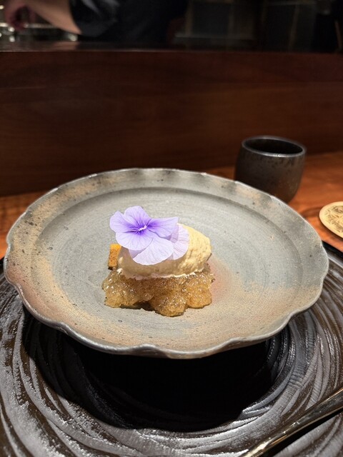 キラキラと輝く昆布出汁のジュレをまとった「蒸麦がき」。口に含むと、凝縮された牡蠣のクリーミーな旨味と、昆布の上品な磯の香りが一気に広がります。ここに合わせるなら、キリッと冷えた甲州テロワール(白ワイン)あたりでしょうか。和の柑橘のような酸が、牡蠣のミネラル感を引き立ててくれそうです。