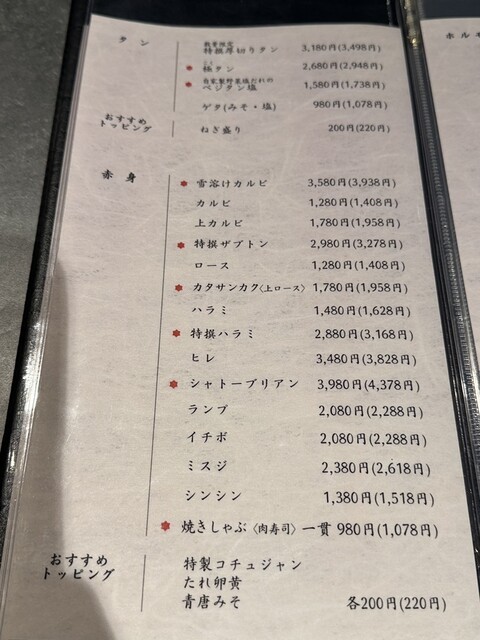 • 特撰ザブトン(¥3,278)は、見てください、この見事な霜降り! 網に乗せるとジュワッと脂が溶け出し、口に運べばとろけるような柔らかさ。上品な脂の甘みが広がり、思わず目を閉じてしまうほどの幸福感です。