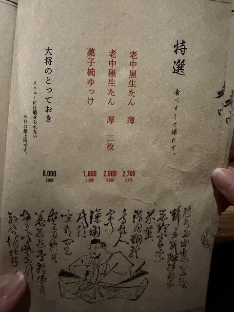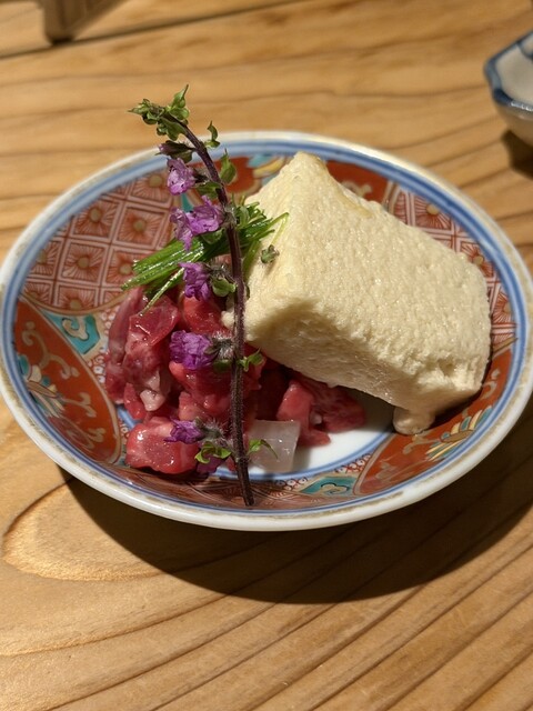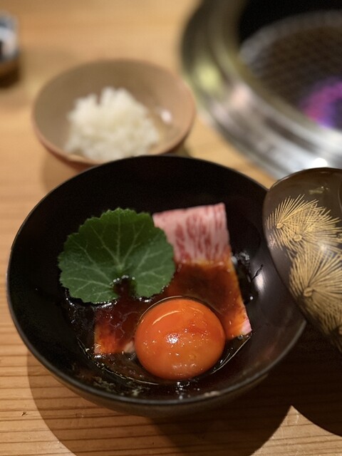 名物 名物 泡醤油とトリュフはらみ刺し 老中の看板メニューの一つ。極めて新鮮なハラミの刺身に、泡立てた特製醤油と芳醇な黒トリュフを贅沢にかけた一品。ハラミの旨みとトリュフの香りの相乗効果が「絶品」と大絶賛されています。和牛ユッケに卵黄を合わせた椀物仕立て。ユッケの旨み、タレの甘み、卵黄のコクが一体となり、滑らかで濃厚な味わいが楽しめます。