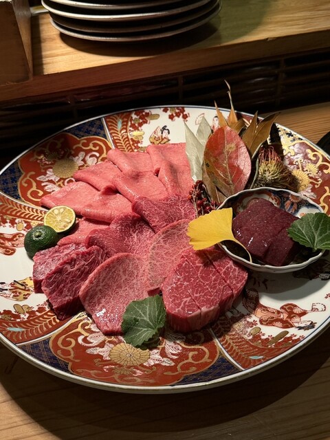 メイン 和牛焼肉 大皿焼肉 老中おまかせ盛り 特別なお肉が入ります。 コースのハイライト。厳選されたシャトーブリアン、ヒレ、タン、レバーなど、日替わりの希少部位が5~6種類、美しく大皿に盛り付けられます。質の高い肉を少量ずつ提供することで、最後まで贅沢に楽しめます。