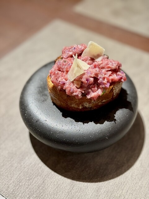 ここで少し趣向を変え、手に取って楽しむ**「馬肉のタルタルのブルスケッタ」**が登場。