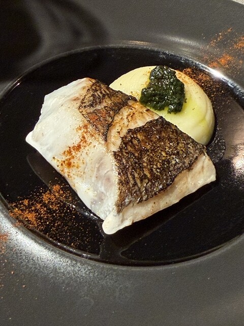 絶妙な温度でオリーブオイルと共に火を入れられた真鯛は、驚くほどしっとりとした質感。仕上げに直火で炙られた皮目のパリッとした食感とのコントラストが見事です。滑らかなジャガイモのピューレと、香り高いバジルソースが、真鯛の旨味を優しく包み込みます。