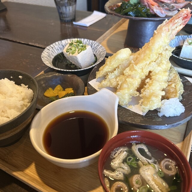 毎朝、市場でお魚を仕入れて、お刺身に特化したランチを提供してくれる。といいながら今日は天ぷらの気分。大海老天ぷら定食は大エビがなんと3本。もープリップリで感動的。相方のお刺身定食も具材が多い。カニやいくらまで!大海老とかぼちゃの天ぷらを1本あげて、カニと甘エビといくらもらいましたw天ぷらもね、大海老3本の他、いか、えりんぎ、なすび、さつまいも、かぼちゃ。もーおなかいっぱい。ご飯は小中大から。炊き立てのご飯、やわらかめでおいしかった。た、たここ、駐車場があんまりないので、いつとおっても満車でなんです。平日、たまたま1台出たので滑り込みました。