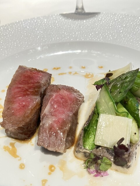 和牛ミスジ肉のロティ 黒オリーブのフラン グリーンアスパラ子と共に