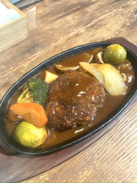 「100%ビーフ煮込みハンバーグ」。芽キャベツ、玉ねぎ、ブロッコリー、人参、マッシュルームが添えてあります。