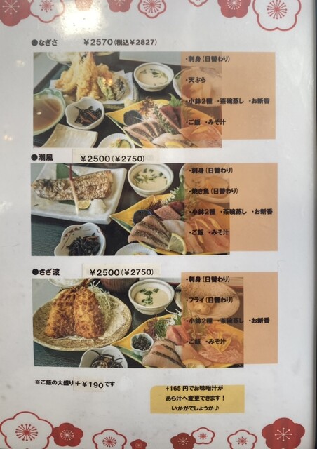 笑顔のお姉さんに迎えられ、海を眺めながら食べれる席を確保。のんびりした雰囲気のなか店内のボードに書かれた魚料理の情報を確認……刺身とフライのセット「さざ波」に決定。味噌汁(青さ)はあら汁に変更しました。