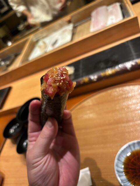 とろたくの手巻きも最高でした。シャキシャキの沢庵とトロの濃厚さをパリッとした海苔で包んで、一口で幸せになれる感じ。コース全体を通して、ネタの質・シャリの塩梅・握りのリズム感、全部がちょうどよくて、食べ進めるのが楽しくなる寿司でした。