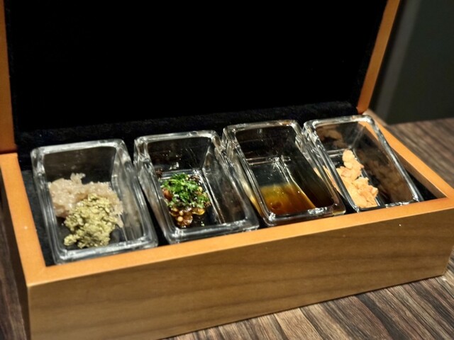 大葉、ホワイトペッパー、花穂紫蘇で味付け。