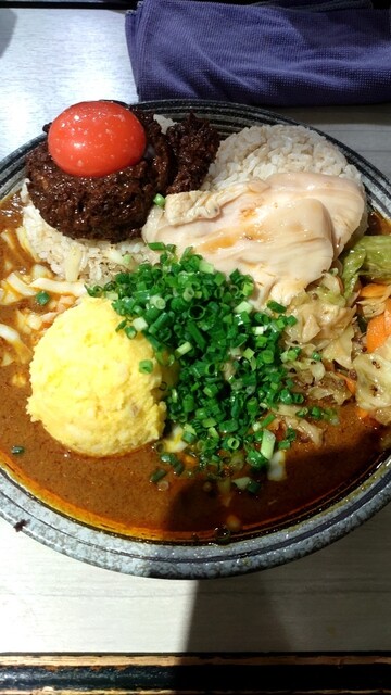 牡蠣とホタテ貝柱のカレーとポテトサラダの大、ローストポーク、中華アチャールをトッピング、3100円、適切な価格