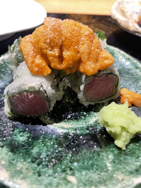 天ぷらは薄い衣であっさり。魚もそうだが、野菜も美味しかった。素材の味を引きだててました。ウニと肉はこんなに合うのかという美味しさ。