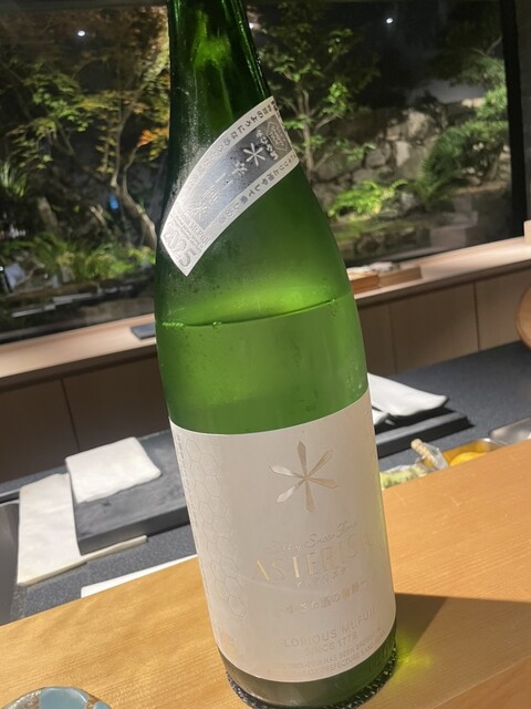 創作鮨の味に加えて、ガラスの向こうにみえる美しい庭園と滝、そして音楽。心地よい空間の虜になってます。