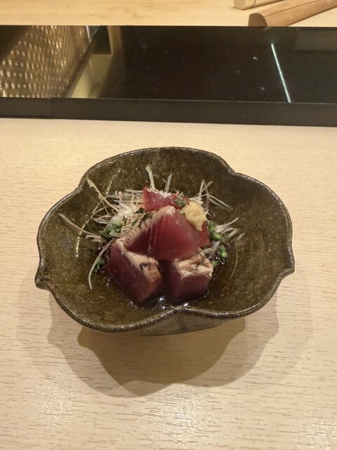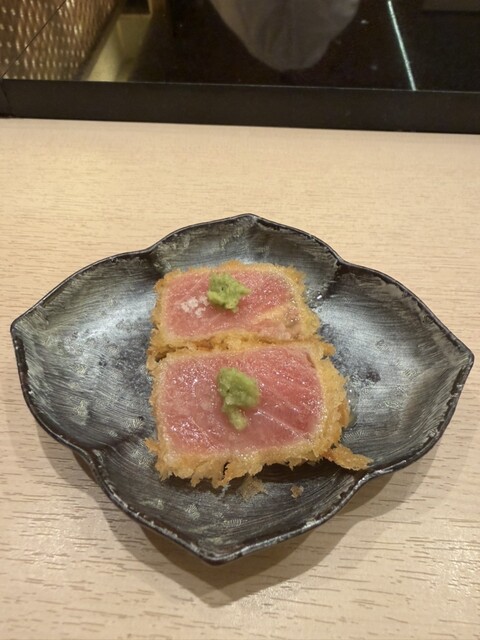 カツオのお造り、マグロのカツとお酒に合うおつまみを頂く