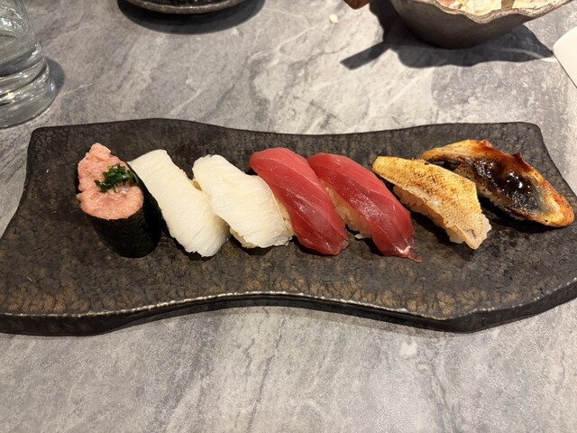 寿司食べ放題コースですが、先にコース料理からになります。本格フレンチのようなコース料理だけでも行く価値はあるかも。その後に食べ放題が始まります。QRコードでスマホで注文できます。お寿司の種類も多いですが、逸品料理や揚げ物、汁物もあります。どれも期待以上に美味しいです。お寿司はマグロはもちろんですが、うなぎも美味しかったです。握りだけでなく手巻きもおすすめです。他のテーブルで誕生日祝いをしていたので、ちょっとした記念日に使うのもありかもです。