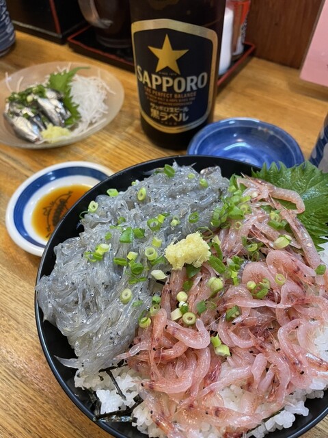 沼津港エリアの開店前から並ぶ名店に初訪問。11:30頃に10組ほど並んでいましたが、開店入店客との入れ替わりがあったのか30分待ちほどで入店できました。今回は、アジフライをセットにした魚河岸定食を注文するか否か迷ったあげく、噂のにし与丼と生しらすと生桜エビのするが丼を注文しました。運ばれてきた丼には溢れんばかりの鮮刺身たちが輝きを放ち、刺身好きには堪らん光景が。