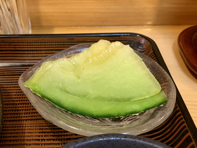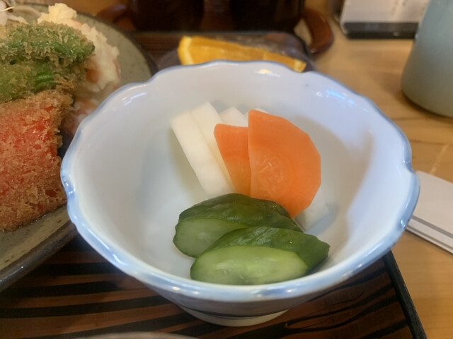 ぬか漬け、添え付けの千切りキャベツ、パセリ、ポテトサラダ♡を楽しみながら、季節の果物を頂き、綺麗に完食‼️♪(v^_^)v