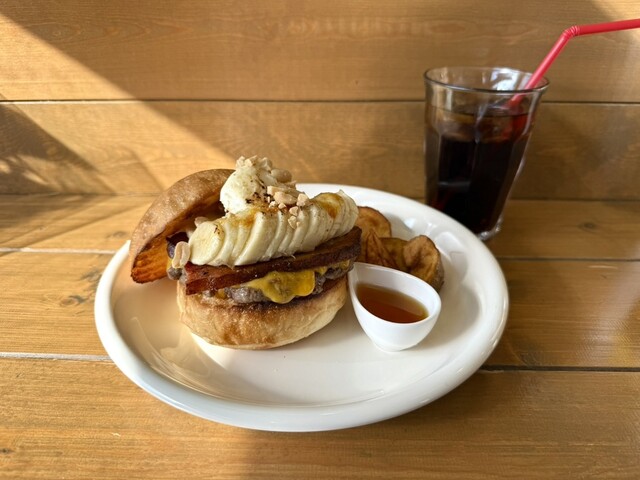 香ばしい♡バンズの食感♡に、サワークリーム・にピーナッツ♡、炙り焼いたバナナの甘みに、自家製スモークベーコン♡の塩味がとスモーキーな香りに、パティに、チェダーチーズ♡、バター合わさりGOOD‼️d(*゚▽゚*)♡