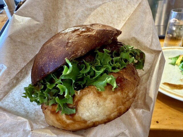 和食の料理人経験のあるオーナーが作る、特製 照り焼きソースの旨み♡、甘み豊かに感じるアメーラトマト♡、瑞々しいフリルレタスの食感が楽しめ、至高のてりやきバーガー♡を食べている♡至福感に包まれます♡(*´꒳`*)